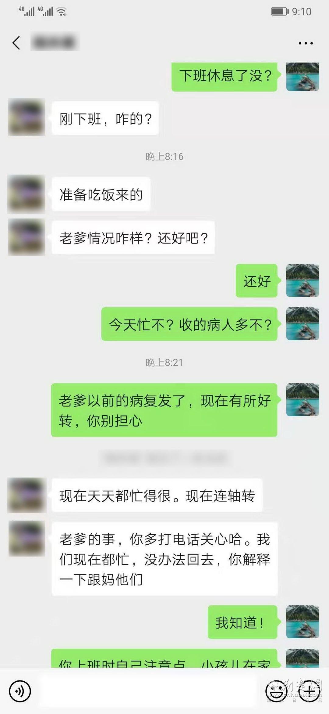 潘紅波和妻子通過(guò)微信相互鼓勁。