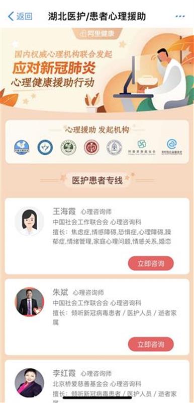 據介紹,針對疫情帶來的公眾心理壓力,支付寶公益基金會與阿里健康聯合國內權威心理健康團隊共同發起“心理健康互聯網援助行動”,通過專業的在線語音心理咨詢服務,緩解受影響人群的心理問題,普及心理健康知識。目前有首批近200位心理健康專家志愿報名在線咨詢服務,他們來自中國心理學會、中科院心理所、中國社會工作協會、北大心理學院、北師大心理學部、北京橋愛基金會等權威心理研究及服務機構。