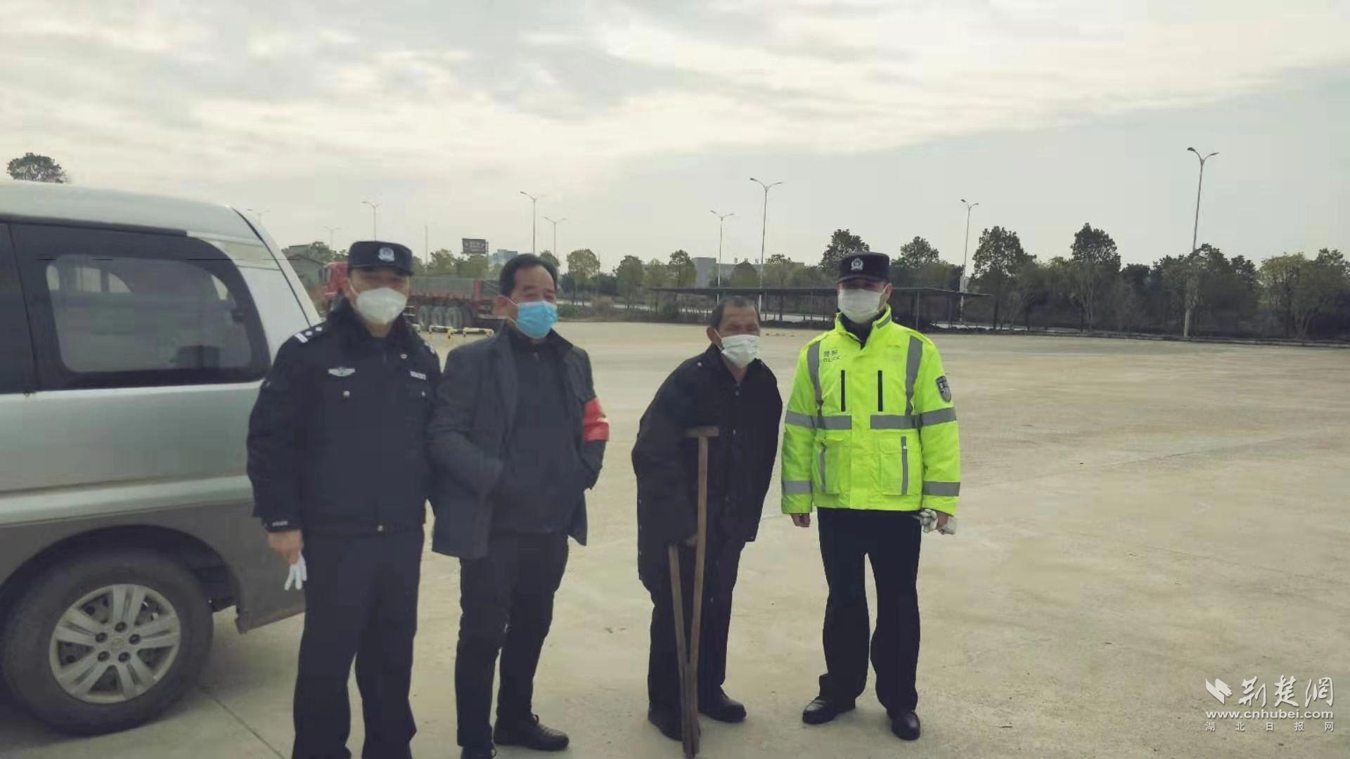 2月1日早晨,老人在月山村卡點(diǎn)被民警發(fā)現(xiàn)時(shí)已饑寒交迫,身體極度虛弱。民警趕緊給老人泡了一碗方便面,又為其測量體溫、戴好口罩。此時(shí),赤壁市公安局黨委委員虢啟超正在卡點(diǎn)巡查,得知情況后他迅速報(bào)告赤壁市防指部,同時(shí)安排孫敦智與交警大隊(duì)民警習(xí)偉共同開警車將老人送回嘉魚。經(jīng)兩地防指部溝通,嘉魚官橋卡點(diǎn)同意放行護(hù)送老人車輛。