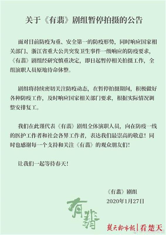 楚天都市報2月2日訊(記者張聰)受新型冠狀病毒引發(fā)的肺炎疫情影響,近期,影視行業(yè)出現(xiàn)停工潮。日前,包括《大江大河2》(王凱、楊爍、董子健主演),《有翡》(趙麗穎、王一博主演),《謝謝你醫(yī)生》(楊冪、白宇主演),《回廊亭》(張新成、鄧家佳主演)等劇組悉數(shù)宣布停工,橫店影視城、象山影視基地等影視基地等也都紛紛關(guān)閉。