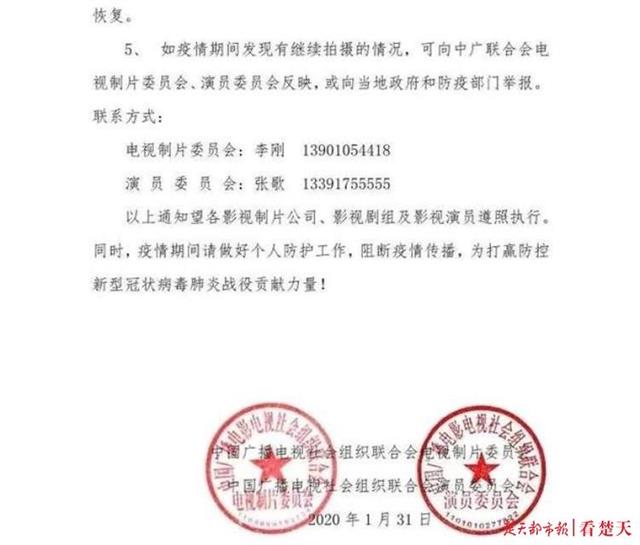 五、如疫情期間發(fā)現(xiàn)有繼續(xù)拍攝的情況,可向中廣聯(lián)合會電視制片委員會、演員委員會反映,或向當?shù)卣头酪卟块T舉報。
