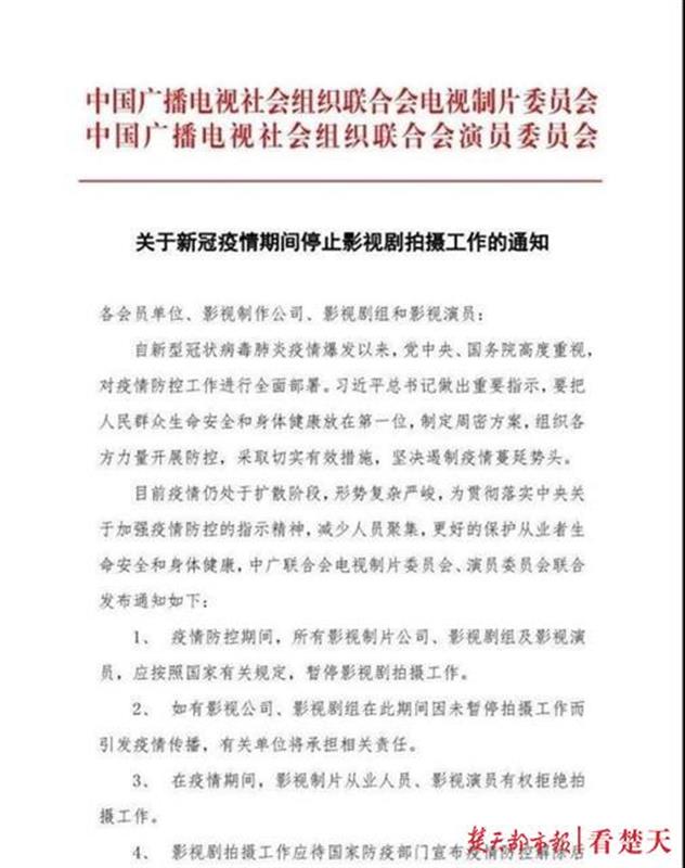 1日,中國廣播電視社會組織聯(lián)合會電視制片委員會、演員委員會聯(lián)合發(fā)布《關(guān)于新冠疫情期間停止影視劇拍攝工作的通知》。《通知》中強調(diào),目前疫情仍處于擴散階段,形勢嚴峻,為貫徹落實中央關(guān)于加強疫情防控的指示精神,減少人員聚集,更好的保護從業(yè)者生命安全和身體健康,要求: