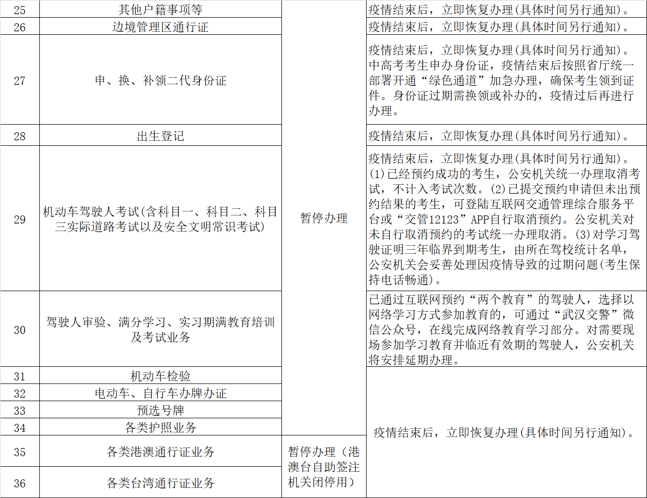 因疫情暫停的機動車駕駛人考試(含科目一、科目二、科目三實際道路考試以及安全文明常識考試),已經預約成功的考生,公安機關統一辦理取消考試,不計入考試次數。已提交預約申請但未出預約結果的考生,可登陸交通管理綜合服務平臺或“交管12123”APP自行取消預約。公安機關對未自行取消預約的考試統一辦理取消。學習駕駛證明三年臨界到期考生,由所在駕校統計名單,公安機關會妥善處理因疫情導致的過期問題(考生保持電話暢通)。暫停的駕駛人審驗、滿分學習、實習期滿教育培訓及考試業務,已通過互聯網預約“兩個教育”的駕駛人,可通過“武漢交警”微信公眾號,在線完成網絡教育學習部分。對需要現場參加學習教育并臨近有效期的駕駛人,公安機關將安排延期辦理。