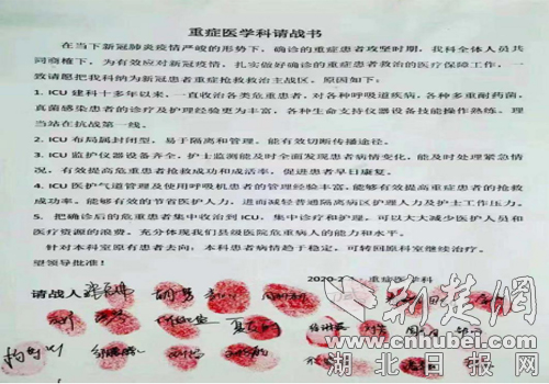 余曼曼所在重癥醫(yī)學科請戰(zhàn)書。通訊員供圖
