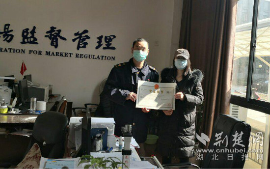 天門市市場(chǎng)監(jiān)管局將新營業(yè)執(zhí)照交到企業(yè)委托的工作人員手中。(通訊員供圖)