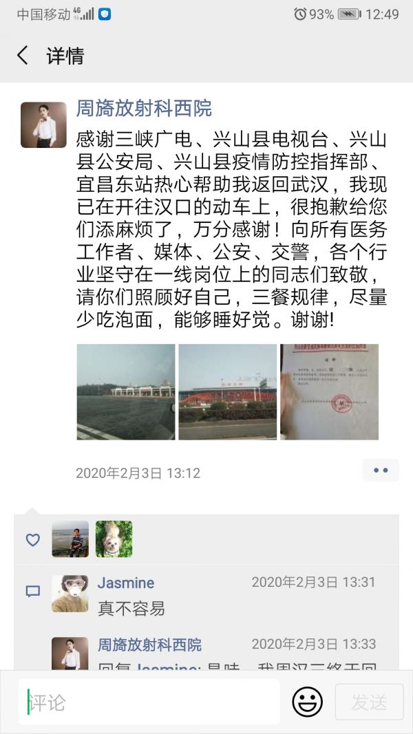 在家隔離的14天,周旖在朋友圈、微信群看到同事們辛苦疲憊的模樣,內心煎熬不已,向科室提出返回申請。礙于交通停運,周旖四處聯系,希望找到可能返漢的辦法,“在家里,我一分鐘都待不下去!”其間,周旖先后找醫院、志愿者、公安局和電視臺等多方求助,最終,興山縣疫情防控指揮部為她開出證明,2月3日上午,剛剛解除14天隔離的周旖由民警一路送到宜昌東站,坐上了返回武漢的動車。