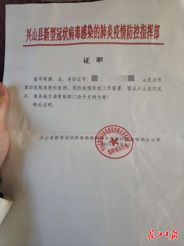 為了回漢,周旖找到興山縣疫情防控指揮部為她開出證明。