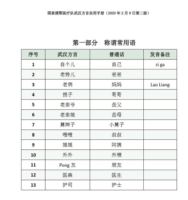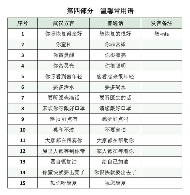 楚天都市報2月10日訊(記者 晏雯 )“葛自噶加油-給自己加油”“軸你呀康復-祝您康復”“你蠻快奏要出克了-你很快就要出去了”“幾滿打針-什么時候打針”“蠻扎實-厲害(有佩服之意)”“拐子-哥哥”“老特兒-爸爸”……咱武漢人一看就明白,這是一句句既輕松又實用的武漢話方言教材。但如果跟您說,這樣一部方言實用手冊,是山東大學齊魯醫院醫療隊,為方便醫生與患者間的交流,專門連夜組織編寫的,是不是在輕松之外,心頭還會涌上絲絲溫情和滿滿暖意。