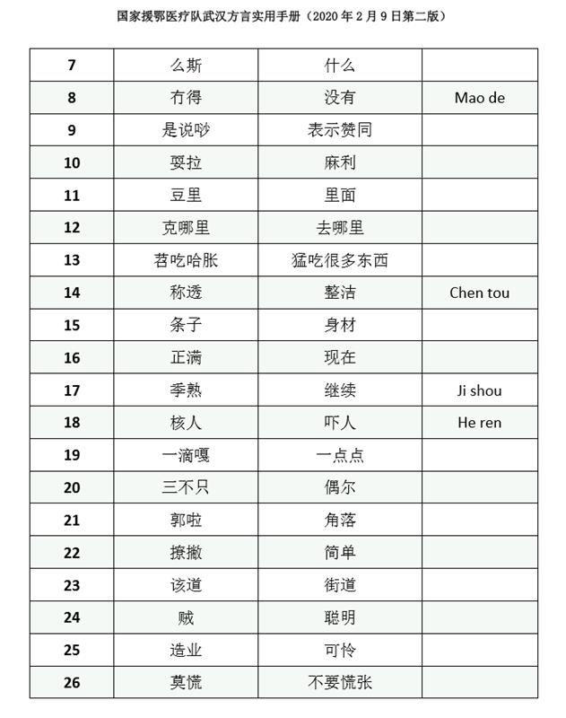 于是,胡昭連夜緊急救助自己在漢的同行,同濟醫院腎內科張春主任和他的護士長幫忙,連夜趕出這份方言手冊。但第二天,組織醫療隊員們學習這份手冊的過程中,大家又遇到一個問題。知道了發音,但如果語調掌握不好,也會溝通不暢。