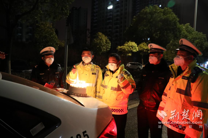 2月7日晚6點,快騎隊員何永建和王利交班后趕到1號值勤點就餐,警車旁,副局長李小平正等著他們,警車后備箱蓋上還放著一個生日蛋糕,原來那天正好是何永建25歲、王利46歲生日。“我知道今天生日,如果是平常,我會和家人聚在一起,但是現在是特殊時期,根本沒想過過生日”何永建說。但是點起蠟燭的那一刻,大家都感慨萬千,希望這次疫情早點過去,兩位壽星吹完蠟燭,大家分享完生日蛋糕后又繼續投入了戰斗。