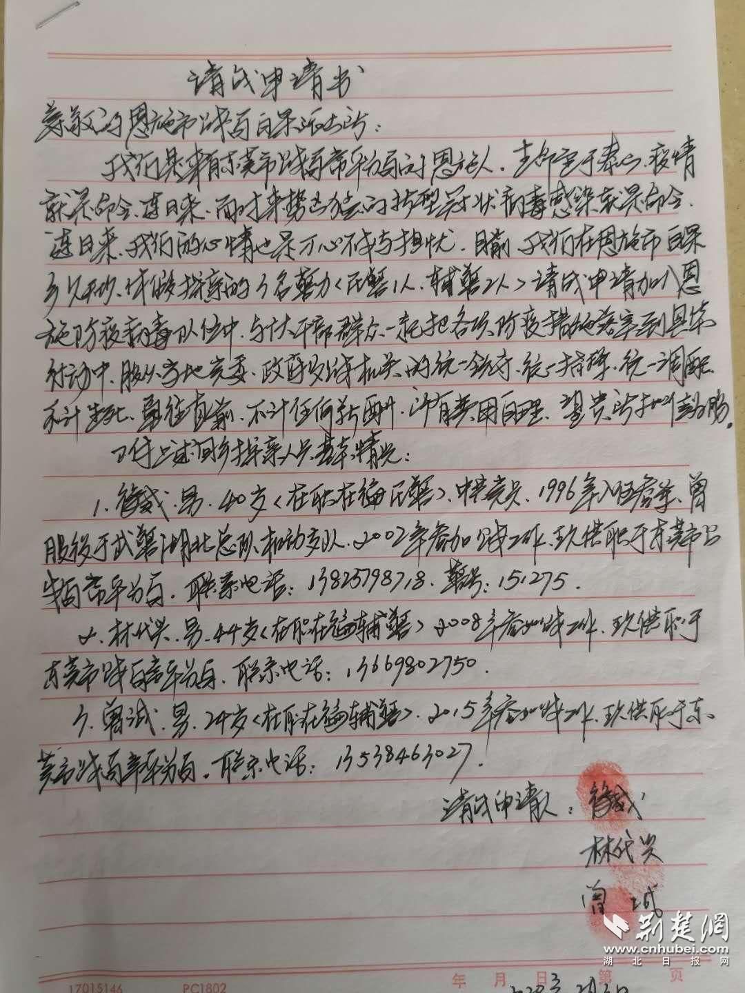 廣東東莞民警徐威等人申請加入湖北恩施市公安局執勤一線請戰書。通訊員供圖