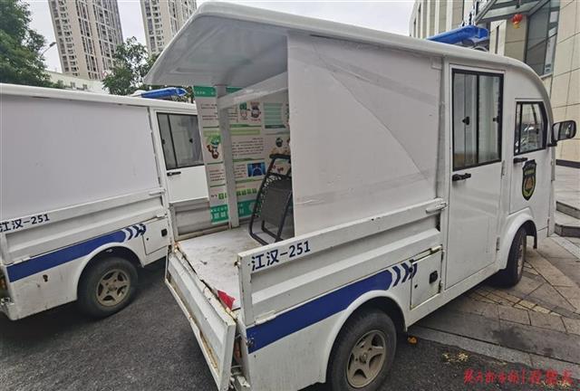 當天,記者在唐家墩街防疫指揮部辦公室外,發現有3輛城管執法電動車與眾不同,只見駕駛室與車斗被用PPC宣傳板隔開。