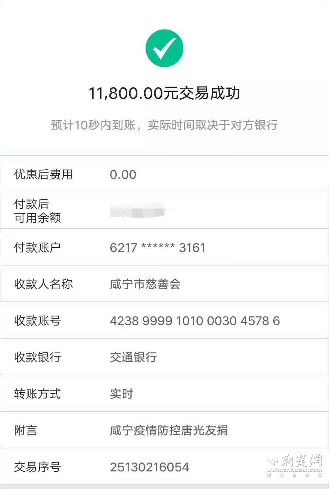 荊楚網(wǎng)客戶端—荊楚網(wǎng)消息(通訊員 包曉霽)“唐副司令,你的捐款已經(jīng)成功了!”2月17日一大早,當(dāng)湖北省咸寧軍分區(qū)干休所協(xié)理員李磊把捐款轉(zhuǎn)賬的截圖打開給唐光友看時(shí),臥榻在床近2個(gè)月的他露出了久違的笑容。
