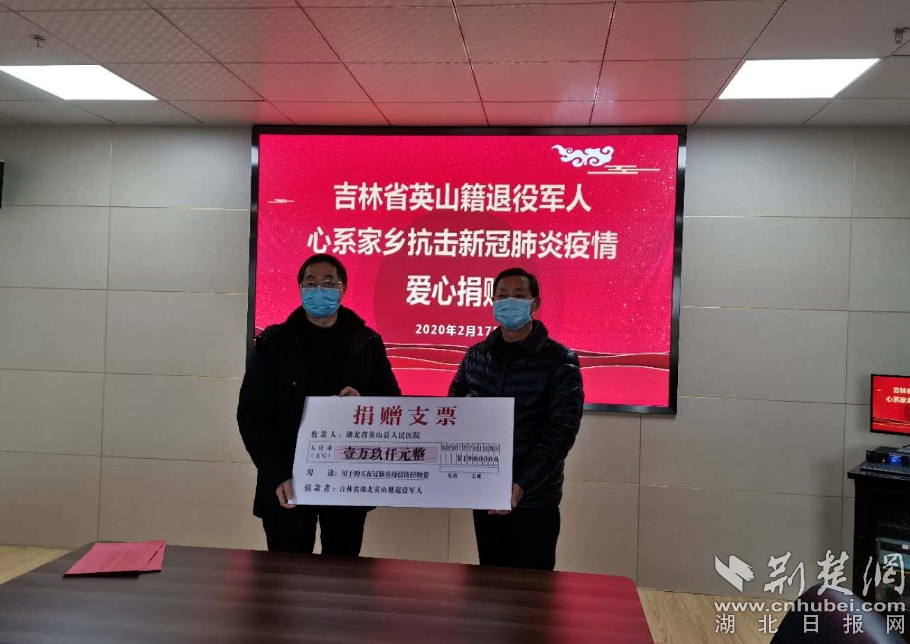 荊楚網客戶端—荊楚網消息(通訊員 劉釗海、余煬)2月17日上午,英山縣退役軍人事務局黨組成員、副局長余洋、何志光來到縣人民醫院,代表在吉林省工作的28名英山籍退役軍人,將1.9萬元定向捐贈“愛心款”轉交到縣人民醫院,表達對家鄉的醫護人員奮勇抗擊新冠肺炎疫情的崇敬之情。