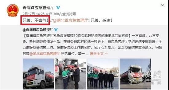 2月17日,青海省應急廳和湖北省應急廳在官方微博中用最樸實的語言表達謝意,一句“兄弟,感謝”,一句“兄弟,不客氣”傳達了兩地親如手足的濃濃情意。