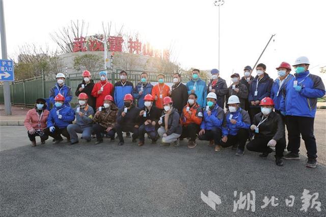 獲得雷神山醫(yī)院榮譽(yù)職工的設(shè)計者、建設(shè)者在醫(yī)院前合影。(視界網(wǎng) 李晗 攝)
