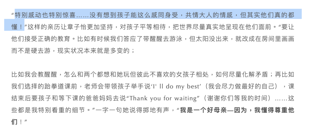 章子怡表示醒醒的一番話讓自己十分欣慰與感動:“特別感動也特別驚喜……沒有想到孩子能這么感同身受,共情大人的情感,但其實他們真的都懂!”