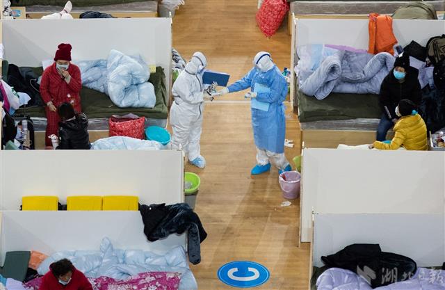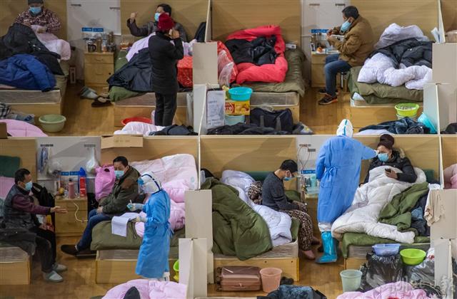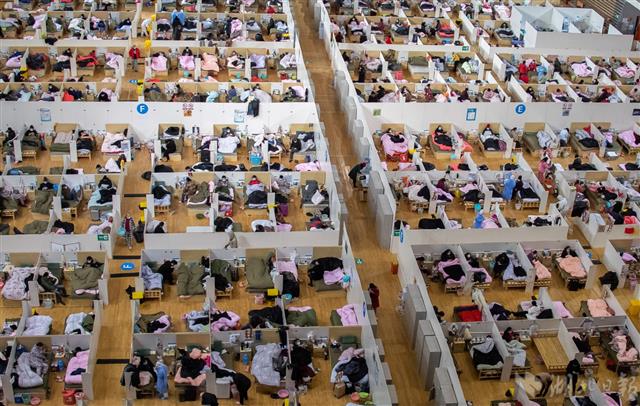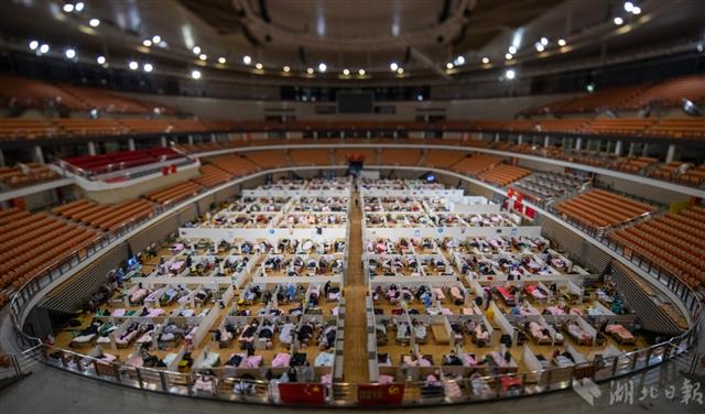 2月18日晚,武漢體育中心方艙醫院宛如承載生命的諾亞方舟。