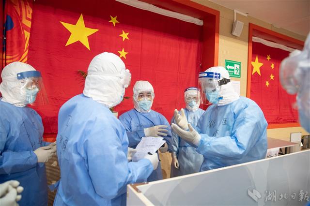 2月14日,武漢體育中心方艙醫院,江蘇醫療隊醫護在交流。