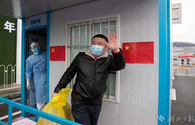 2月21日,武漢漢陽方艙醫院,經過了全身消毒和更衣的治愈患者走出醫院,向送行的醫護人員揮手致意。