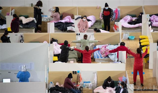 2月18日晚,武漢體育中心方艙醫院,患者在走道做操,護士在辦公區忙碌。