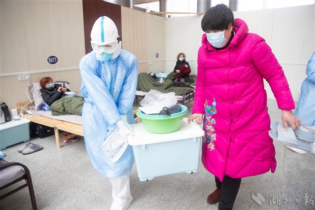 2月12日,武漢江岸塔子湖體育館方艙醫院,天津醫療隊護士幫病人抬行李。