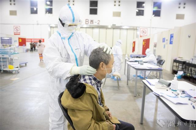 2月18日晚,武漢體育中心方艙醫院,護士為患者測量生命體征。