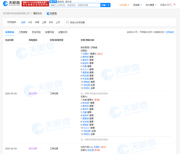 網易娛樂2月27日報道 2月27日上午消息,天眼查數據顯示,近日,京東數科的運營主體京東數字科技控股有限公司發生工商變更,劉強東卸任法定代表人和董事長,京東數科CEO陳生強接任法定代表人,余睿接任董事長。