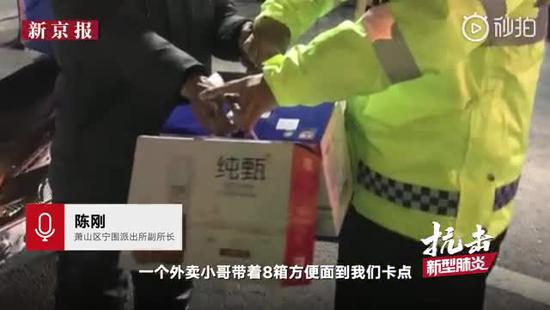 2月初,在杭甬高速蕭山進出口防疫檢查站,一白色汽車突然調(diào)頭,停在了檢查站。車窗搖下,一名男子跟隊員說:“你好,我是孫楊,我點了外賣送你們,辛苦了?!闭f完,車就開走了。隨后,外賣小哥先后送來了8箱牛奶、8箱方便面和8箱粥。