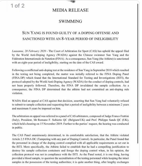 網(wǎng)易娛樂2月28日報道 28日17時,國際體育仲裁法庭(CAS)公布了“世界反興奮劑機構(WADA)訴孫楊和國際泳聯(lián)案聽證會”的裁決書,孫楊被禁賽八年,即日起生效。此前,他曾為杭甬高速蕭山進出口防疫檢查站的民警們點了外賣,送來了八箱牛奶、八箱方便面和八箱粥,感謝民警們的辛苦付出。