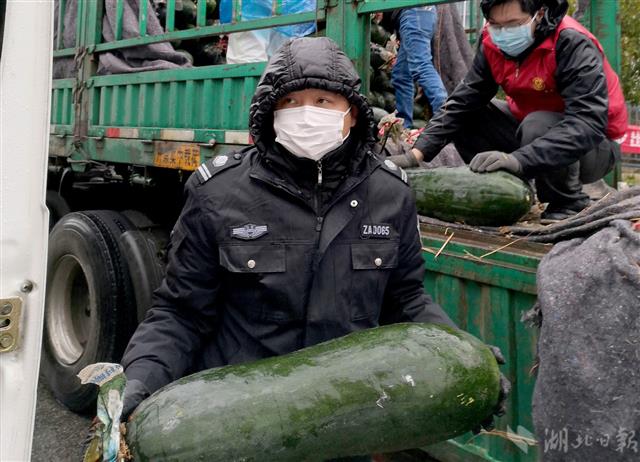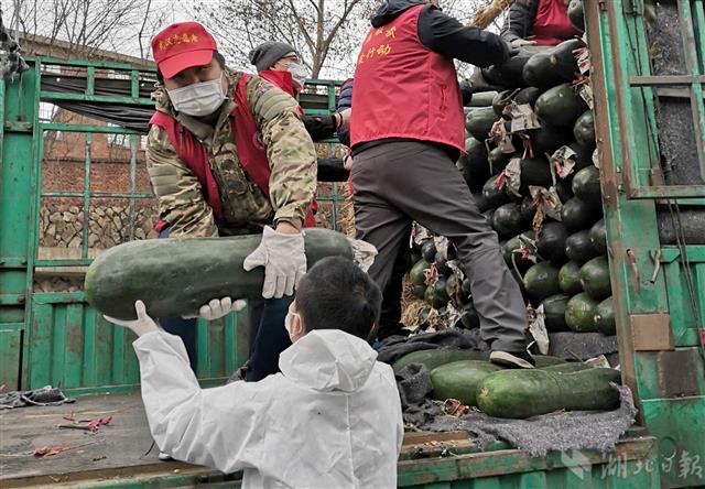 2月28日下午,武昌區糧道街東龍社區收到了湖北省廣播電視局募捐來的15噸愛心冬瓜。