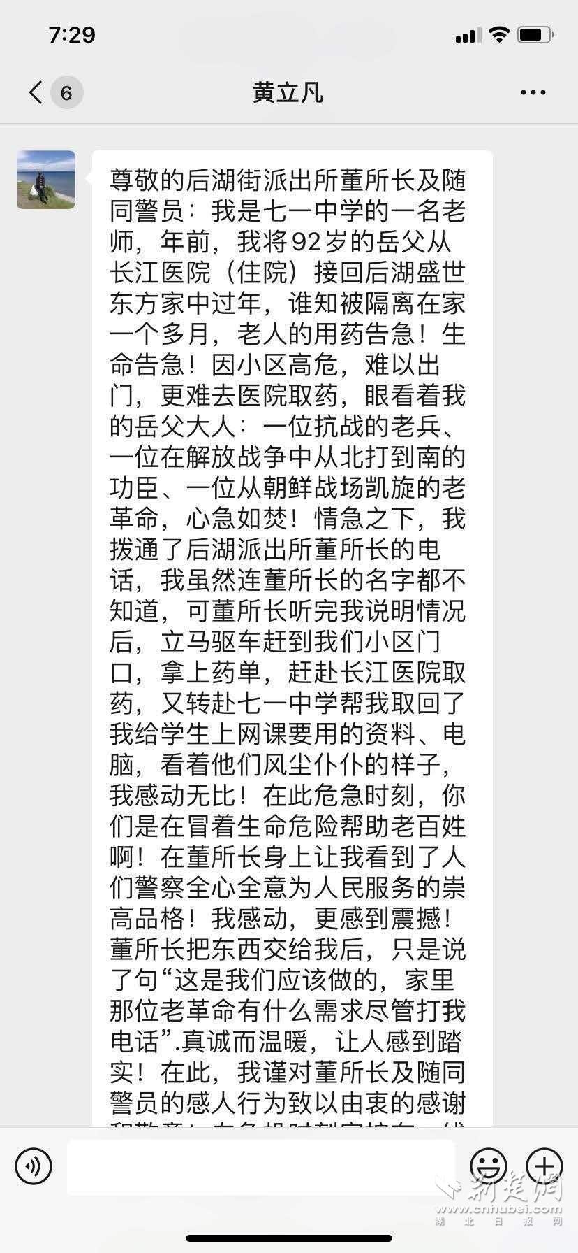 3月1日,黃老師告訴記者,他與董所長素不相識,只是從小區(qū)里的“警民聯(lián)系牌”看到了他的電話,原本只是想咨詢一下,沒想到董所長主動提出幫忙,這讓他非常感動,于是連夜寫了這封感謝信。他在信中說,“在此危急時刻,你們冒著生命危險幫助老百姓!在董所長身上讓我看到了人民警察全心全意為人民服務的崇高品格!我感動,更感到震撼!”
