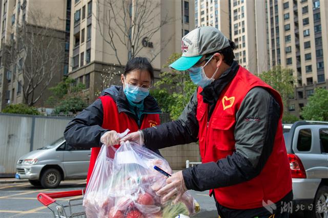 3月1日,武漢市洪山區仁和路社區,80后黨員夫妻程耀儒(右)、朱競爭在金地自在城小區為居民送菜。程耀儒、朱競爭夫妻倆同為武漢地鐵集團的職工,自2月9日下沉社區以來,每天同另外7名地鐵干部職工值守社區,為居民送菜送藥,成為了仁和路社區的守門員、宣傳員和服務員。(湖北日報全媒記者 蔡俊 通訊員 袁永華 攝)