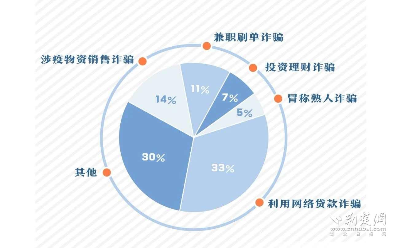 根據湖北省公安廳反電信網絡詐騙中心總結的查處打擊情況看,易發多發犯罪主要集中在以下五類詐騙:一是利用貸款詐騙,約占發案總數33%;二是涉疫物資銷售詐騙,約占發案總數14%;三是兼職刷單詐騙,約占發案總數11%;四是網絡投資理財詐騙,約占發案總數7%;五是冒充熟人詐騙,約占發案總數5%。