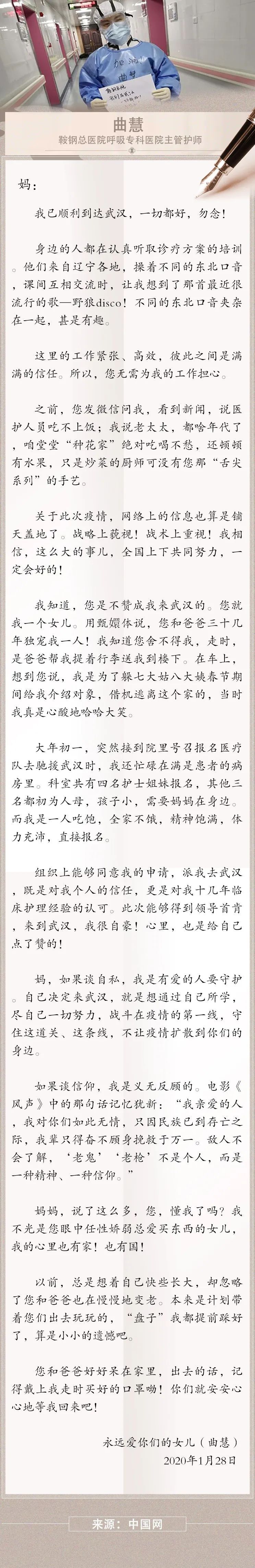 1月26日,曲慧隨遼寧省首批援鄂醫療隊抵達武漢,進駐武漢協和江北醫院(蔡甸區人民醫院)。28日,她寫了一封家書發給家人,字里行間東北人式的幽默讓這個80后姑娘令人動容又充滿正能量。