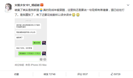 下午,楊超越在微博po出一段聊天記錄,澄清煙盒不是自己的,并表示“破案了其實是我家貓,真的剛成年愛耍酷”“貓已經在打了”。在po出的聊天記錄中,楊超越也向對方表示煙盒不是自己的,當對方表示這會成為有人刷黑詞條的素材時,楊超越則大方表示:“那多好啊,黑詞條多一個不多,少一個不少。”