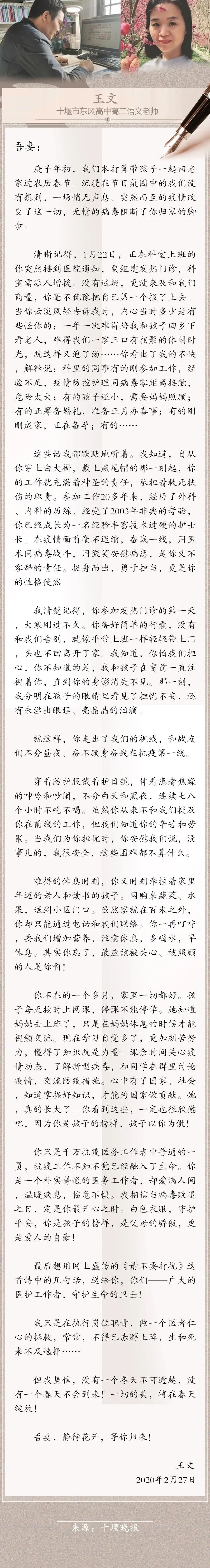 王文是十堰市東風(fēng)高中高三語文老師,妻子程曉娜是國藥東風(fēng)總醫(yī)院消化內(nèi)科護(hù)士長,目前仍在醫(yī)院發(fā)熱門診支援。