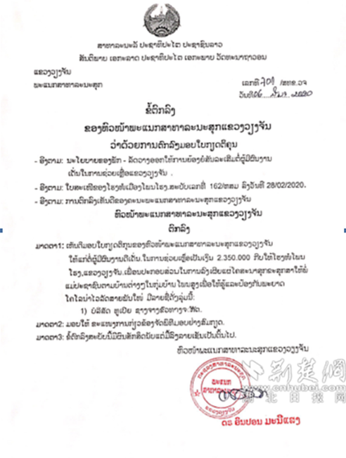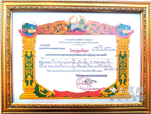 荊楚網(wǎng)客戶(hù)端—荊楚網(wǎng)消息(記者趙秀琳 通訊員石祎瑋)“對(duì)貴項(xiàng)目部在萬(wàn)象省預(yù)防新冠肺炎防控宣傳給予的支持,表示感謝!你們展現(xiàn)出了中國(guó)企業(yè)在疫情面前的責(zé)任與擔(dān)當(dāng),為增進(jìn)中老友誼貢獻(xiàn)了自己的力量。”這是老撾萬(wàn)象省衛(wèi)生廳寫(xiě)給湖北交投建設(shè)集團(tuán)長(zhǎng)江路橋公司老撾北13號(hào)公路項(xiàng)目部的感謝信和頒發(fā)獎(jiǎng)狀中的內(nèi)容。