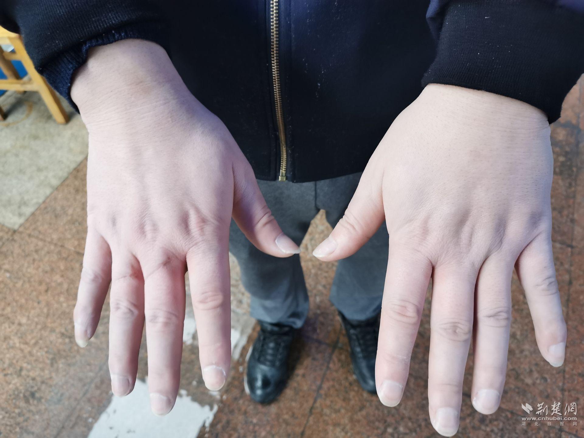 江齊鳴的雙手因為反復消毒而泛白浮腫。通訊員供圖