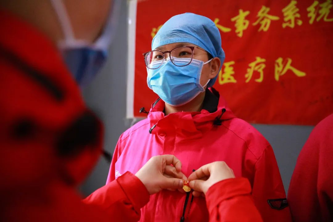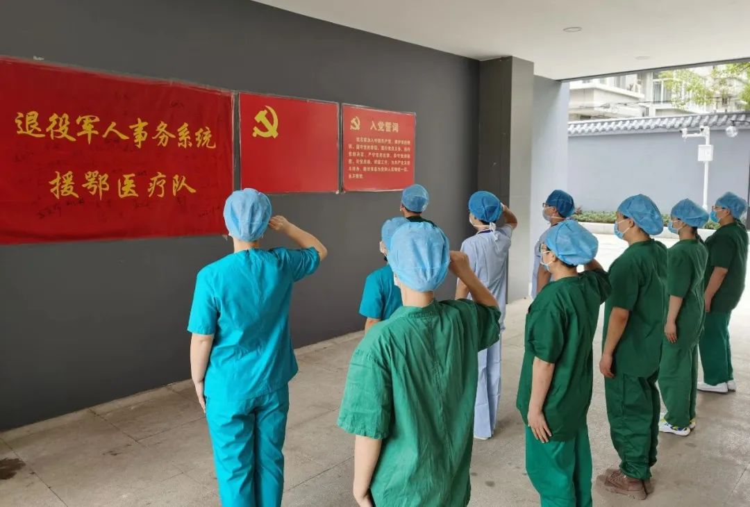 3月8日,退役軍人事務系統援鄂醫療隊臨時黨支部于湖北省榮軍醫院舉行入黨宣誓儀式,在戰“疫”一線接收鄒雁、蔣鳳美、涂可可、聶愛珍、萬劉楊、張騰、王雅琴、李志芳、張淑雅9名醫務工作者加入中國共產黨,成為預備黨員。