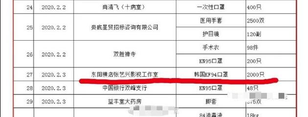 公示信息顯示,該次捐贈以東陽橫店張藝興影視工作室的名義,于2月3號捐贈2000只韓國KF94口罩。網友紛紛贊嘆張藝興默默做公益,傳遞正能量。