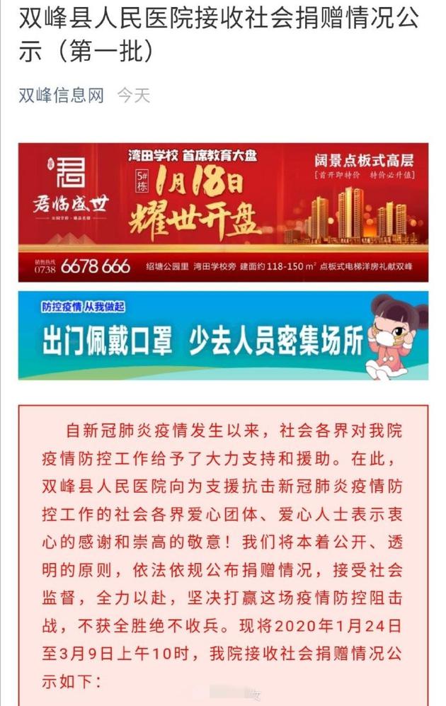 網易娛樂3月12日報道 近日,有網友從湖南省婁底市雙峰縣公示的物資捐贈說明中發現,張藝興向雙峰縣人民醫院捐贈了2000只口罩。