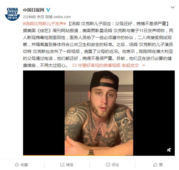 據(jù)美國(guó)《綜藝》周刊網(wǎng)站報(bào)道,美國(guó)男影星湯姆·漢克斯與妻子11日發(fā)聲明稱,兩人新冠病毒檢測(cè)呈陽(yáng)性,醫(yī)務(wù)人員給了一些必須遵守的協(xié)議,二人將接受測(cè)試觀察,并隔離直到身體符合公共衛(wèi)生和安全的標(biāo)準(zhǔn)。之后,湯姆·漢克斯的兒子演員切特·漢克斯也發(fā)布了一段視頻,透露了父母的近況。他表示,剛剛同在澳大利亞的父母通過(guò)電話,他們都還好,病得不是很嚴(yán)重。目前,他們正在進(jìn)行必要的健康措施,不用太過(guò)擔(dān)心。
