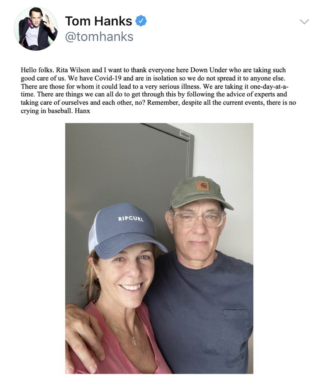 網易娛樂3月13日報道 3月12日,好萊塢演員湯姆·漢克斯公開聲明,表示自己與妻子麗塔·威爾遜在澳大利亞拍攝新片時感染新冠肺炎。13日,湯姆·漢克斯再公開發聲報平安,稱他與妻子正在隔離,不會傳染給任何人,并且會遵循專家建議以渡過難關。