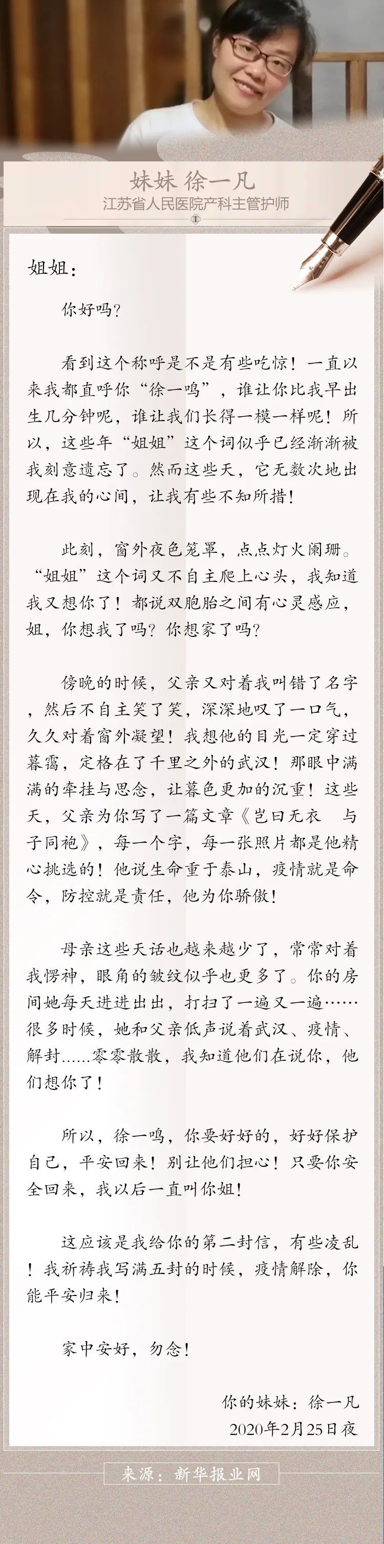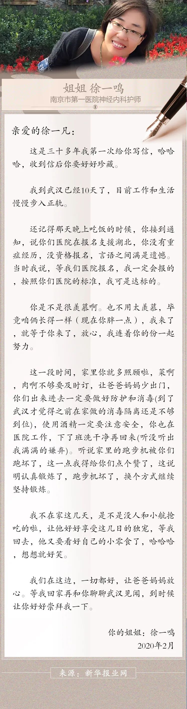 留守南京的妹妹和父母為身處一線的姐姐感到自豪,但也充滿了擔憂,于是給姐姐寫下一封信,祈禱她能早日平安歸來。徐一鳴也給妹妹寫了一封回信:" 我來了,就等于你來了,放心,我連著你的份一起努力。"