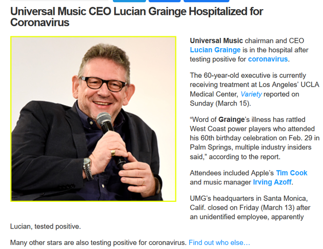 網易娛樂3月16日報道 據(jù)外媒報道,環(huán)球音樂董事長兼首席執(zhí)行官Lucian Grainge檢測出冠狀病毒呈陽性,目前正在洛杉磯加州大學洛杉磯分校醫(yī)療中心接受治療。據(jù)報道,多位業(yè)內人士說:“2月29日,在棕櫚泉參加Lucian Grainge60歲生日慶祝活動的西海岸電力公司員工聽到Lucian Grainge生病的消息后感到不安。”,當天與會者包括蘋果公司的蒂姆·庫克和麻辣雞的音樂經紀人Irving Azoff。