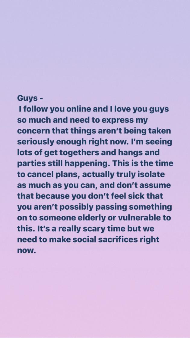 “各位,我一直都有在網上關注你們,我非常愛你們,我需要表達我的擔憂,我擔心現在事情還沒有得到足夠的重視。我看到有很多聚會,還有派對。這是取消計劃的時候了,實際上要盡可能地隔離,不要因為你不覺得不舒服就認為你不可能把一些東西傳給年長者或易受影響的人。這是一個非常可怕的時刻,但我們現在需要做的就是為社會犧牲我們的娛樂性。”