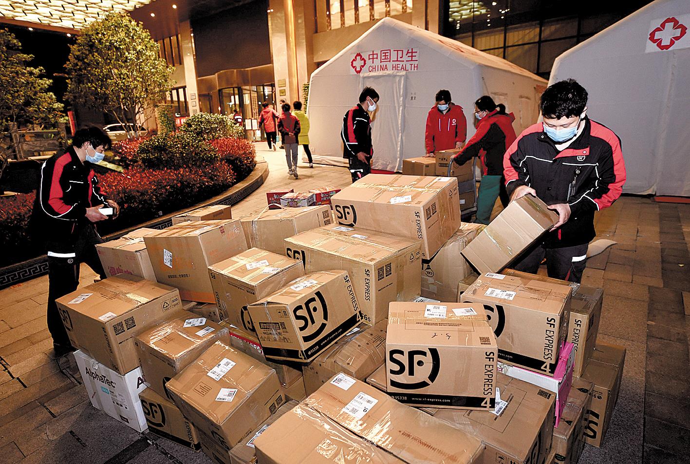 3月16日晚9時(shí),武漢東西湖華美達(dá)酒店門(mén)口,順豐速運(yùn)的三名快遞小哥仍在收寄來(lái)自新疆、重慶、江蘇等醫(yī)療隊(duì)的物品。湖北順豐自3月14日起,為所有援鄂醫(yī)療團(tuán)隊(duì)提供返程行李免費(fèi)寄遞服務(wù),以實(shí)際行動(dòng)致敬逆行奮戰(zhàn)在抗疫一線的白衣天使們。