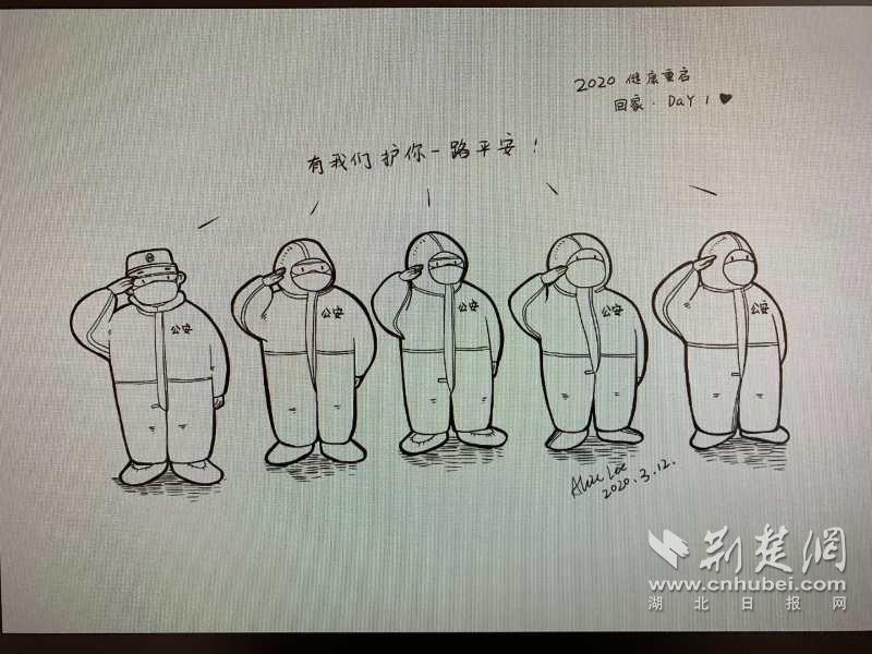 “3月12日,我隔離期滿要回家了。”翻看從入艙到隔離觀察所畫的插畫,黎婧滿是感慨。她說,這里的公安干警,每個人都在默默幫助患者,幫助他們盡快康復、盡早回家。