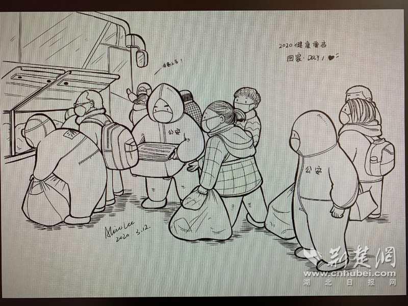 拿起手機,黎婧把這一瞬間拍攝下來。“私下,我和這名工作人員成了朋友,原來他是武漢市公安局東新分局的民警馬山。”回到隔離康復住所,黎婧用畫筆把這一幕呈現在了紙上。